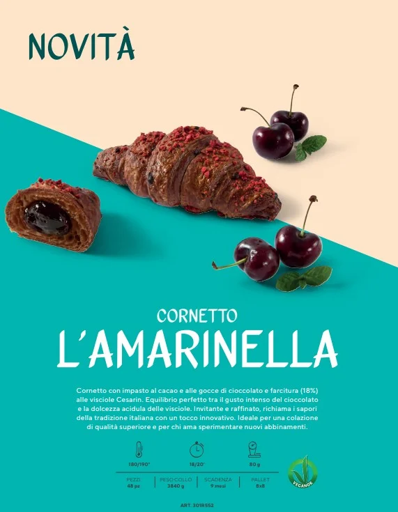 Cornetto con impasto al cacao e alle gocce di cioccolato e farcitura (18%) alle visciole Cesarin. Equilibrio perfetto tra il gusto intenso del cioccolato e la dolcezza acidula delle visciole. Invitante e raffinato, richiama i sapori della tradizione italiana con un tocco innovativo. Ideale per una colazione di qualità superiore e per chi ama sperimentare nuovi abbinamenti.